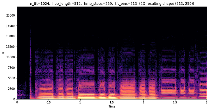 To generate information about the whole file, we can take an FFT of a 1024 sample window, and slide it by 512 samples (hop length) so that the windows overlap with each other. For this three second file, that will give us 259 frequency spectrums, which we can then view as a 2-dimensional image. This is called a short-time Fourier Transform (STFT), and it allows us to see how different frequencies change over time.