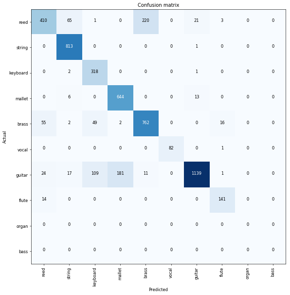 It looks like mallets are getting confused with guitars, and reeds are being confused with brass instruments the most. Using this information, we could look more closely at the spectrograms of those instruments, and try to decide if there are better parameters we could use to differentiate between them.
