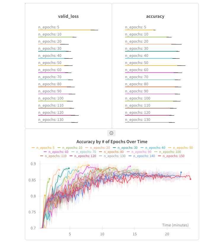 In this sweep, 20 epochs produced the lowest validation loss, 50 epochs achieved the highest accuracy, and training for 150 epochs over 23 minutes was actually worse than training for 20 epochs in only 3.5 minutes.