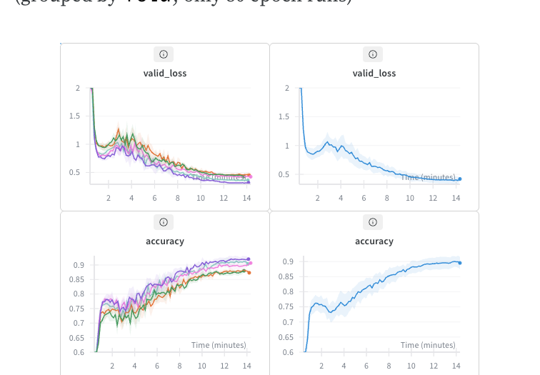 After training 1,430 models and analyzing the results with W&B, I was able to find hyperparameters that fine-tune a ResNet-18 (pre-trained on image data) to reach 89.5% accuracy in under 4 minutes, and a DenseNet-161 to 91.47%. I expect that more specialized models informed by domain expertise could go even higher with similar spectrogram settings.