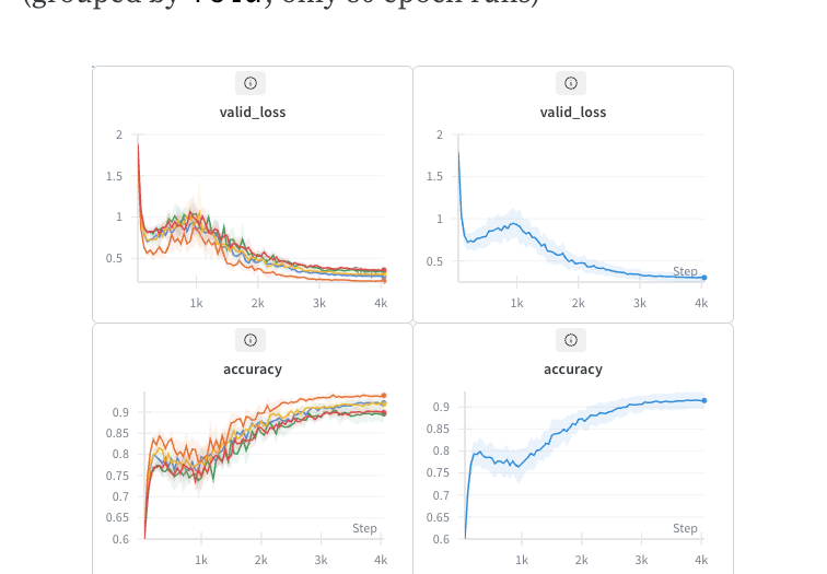 I used the new version of fastai along with fastaudio to train the models, and W&B to track each run. Fastai makes the integration easy — just add a callback to the Learner object. The "Sweep" feature of W&B was especially useful: define which parameters to vary, then turn on one or more agents to train a model for every combination (grid search). I rented a cloud GPU server from DataCrunch.io with 8× V100 GPUs for about 24 hours and trained 1,430 models in total.