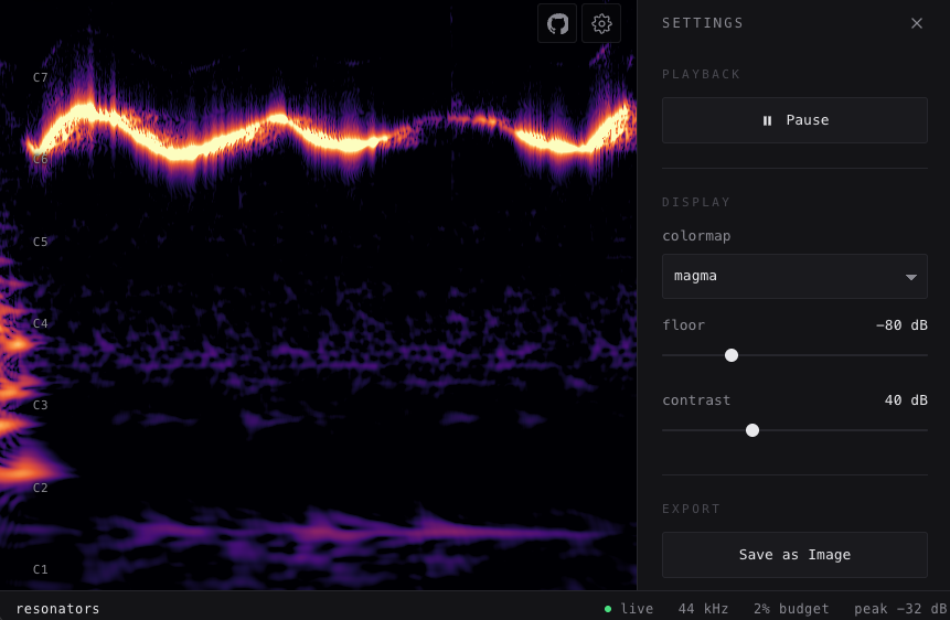 const spectrogram = bank.resonate(signal, 256);resonators is just the first step of a broader exploration into real-time music analysis with ML. In the next post I'll be detailing how to feed resonator output directly into machine learning models that run in the browser, all with the core pipeline written in Rust.