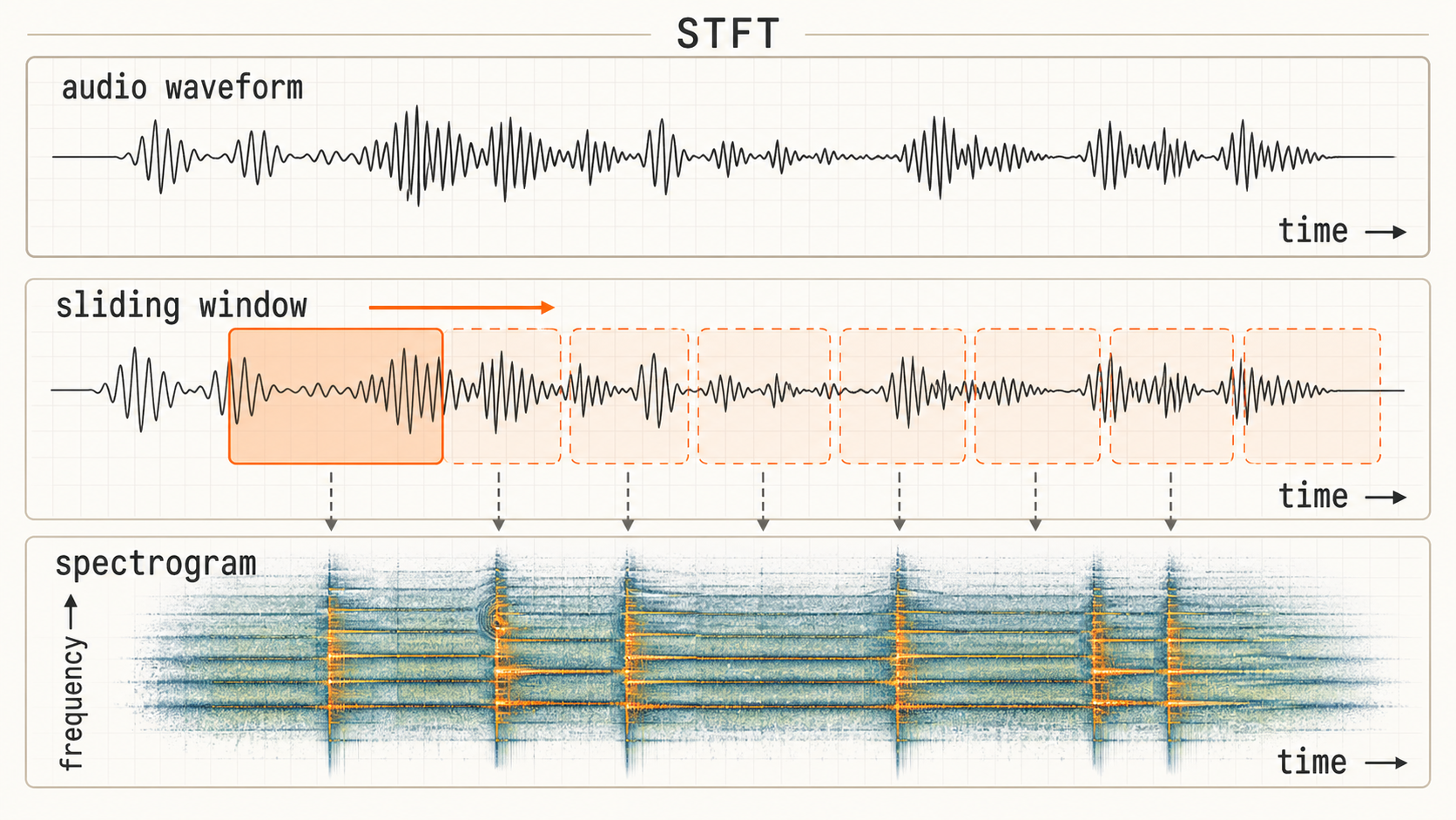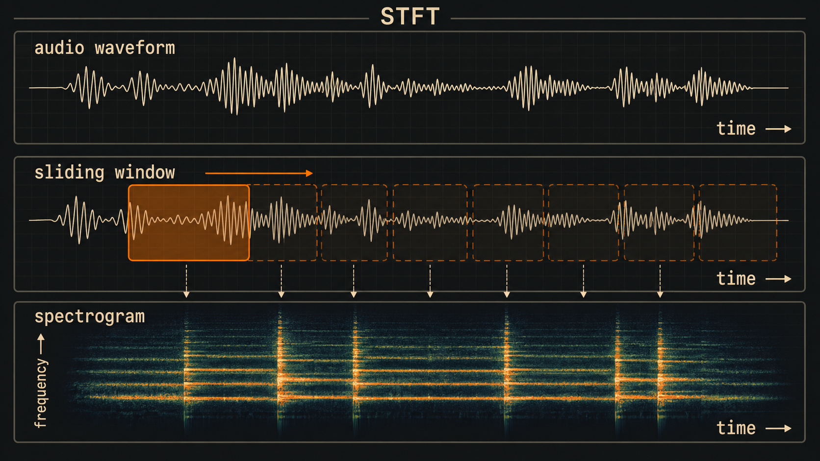 When training machine learning models on audio, it's common to first transform the signal into an image-like representation called a spectrogram. Raw audio is most commonly stored as a 1-dimensional sequential array of numbers between -1 and 1 (mono is a single array, stereo signals are stored as 2 arrays, one channel for the left speaker, and one for the right). The Fourier transform allows us to analyze which frequencies are present in the signal in a given window of time. If we slide a small window forward in time, we're able to "see" how the signal's frequency content changes through time. This is known as the Short-Time Fourier Transform (STFT). For a deeper visual intuition on signals and the Fourier transform, Jack Schaedler's Circles, Sines, and Signals is a great interactive primer.